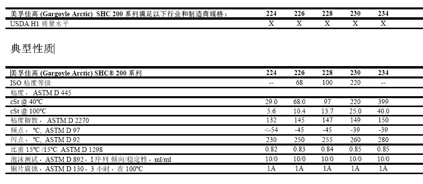 应用范围 美孚佳高 (Gargoyle Arctic) SHC 200 系列是全合成润滑油,专为制冷压缩机和热力泵润滑而设计。 应用时需要考虑的事项:虽然美孚佳高 (Gargoyle Arctic) SHC 200 系列油品能与矿物油相容, 但两者的混合使用会降低合成油品性能。用美孚佳高 (Gargoyle Arctic) SHC 200 系列合成油替换矿物油时,应将系统彻底冲洗干净。 典型应用如下: 商业、工业和热力泵应用及海运制冷系统 商业、工业和住宅用热力泵 往复式和回转式两种压缩机都可使用 推荐与以下制冷剂配用:氨和二氧化碳
